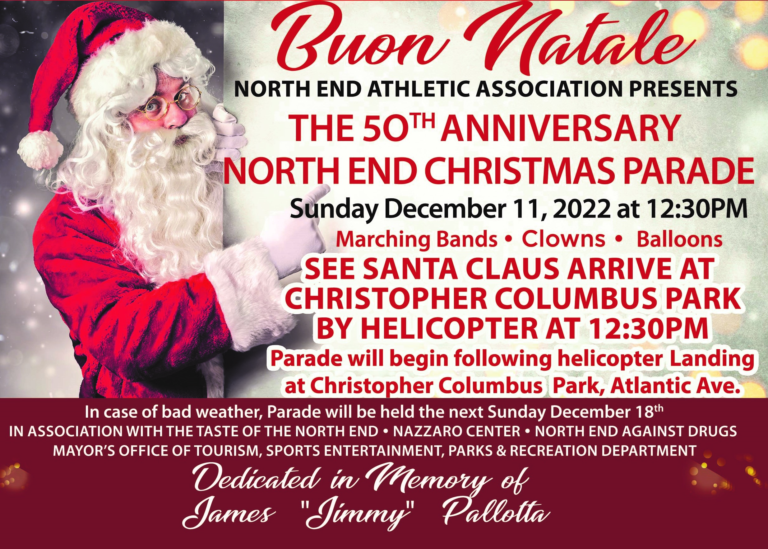 Celebrating the 50th Anniversary, the North End Athletic Association will bring Santa to visit the residents of the North End. Santa will arrive by helicopter on Sunday, Dec. 11, 2022, at 12:30 pm, at the Christopher Columbus Park on Atlantic Avenue, Boston.