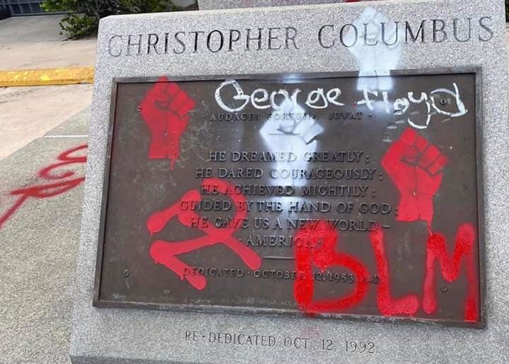 In Miami, demonstrators spray-painted statues of Columbus and Ponce de León, another Spanish explorer who landed in Florida, in Bayfront Park with the letters “George Floyd,” “BLM” (Black Lives Matter), and a hammer and sickle. Miami police said officers who responded to the scene were assaulted and their car was damaged.
