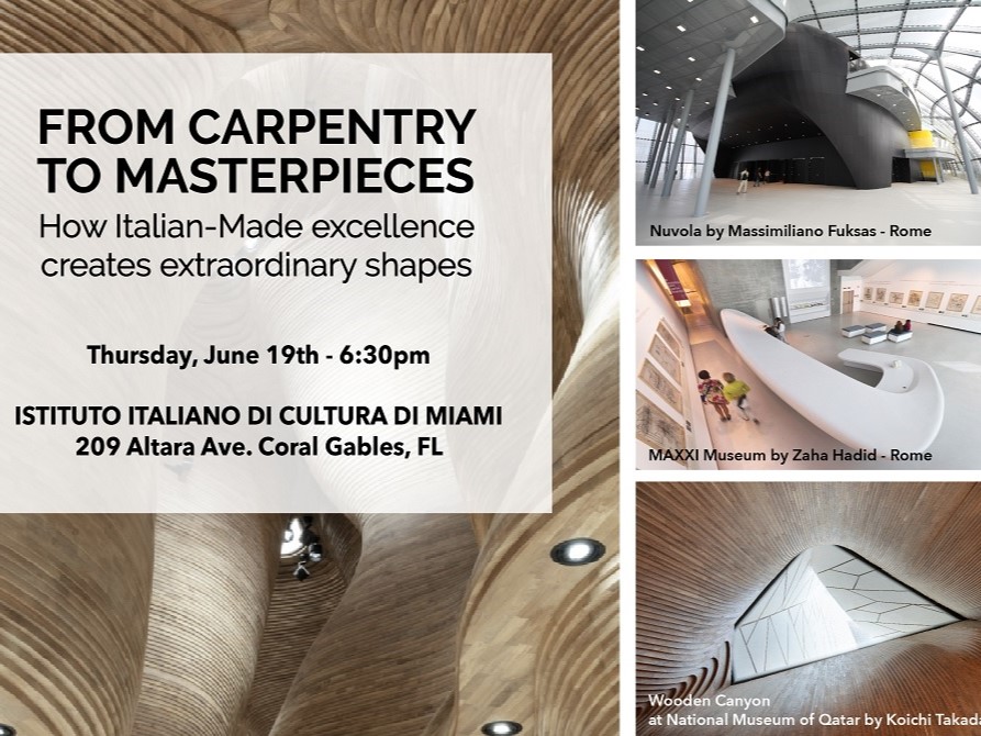 On Thursday, June 19th, at 6.30 pm the Italian Cultural Institute in Miami (209 Altara Ave., Coral Gables) will host the talk From Carpentry to Masterpieces. How Italian-Made excellence creates extraordinary shapes, a special event dedicated to innovation in architectural design and the promotion of Made in Italy through the integration of advanced technologies and artisanal tradition.