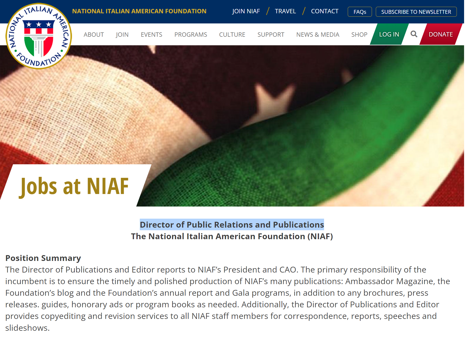 The Director of Public Relations and Publications reports to NIAF’s President and CAO. The primary responsibility of the incumbent is to ensure the timely and polished production of NIAF’s many publications: Ambassador Magazine, the Foundation’s blog and the Foundation’s annual report and Gala programs, in addition to any brochures, press releases, guides, honorary ads or program books as needed.