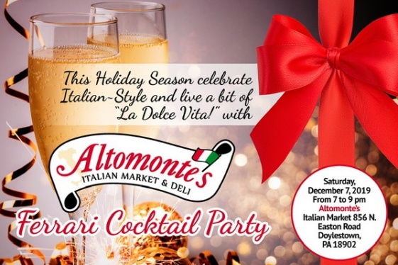 Kick off the holiday season and celebrate in style with family and friends at Altomontes’ Italian Market, 856 N. Easton Road, Doylestown PA on Saturday, December 7th from 7:00 to 9:00 pm. An all-inclusive epicurean evening where you can eat, drink and be merry! The special event will feature tantalizing food stations, live music, glamorous cars, Fe...