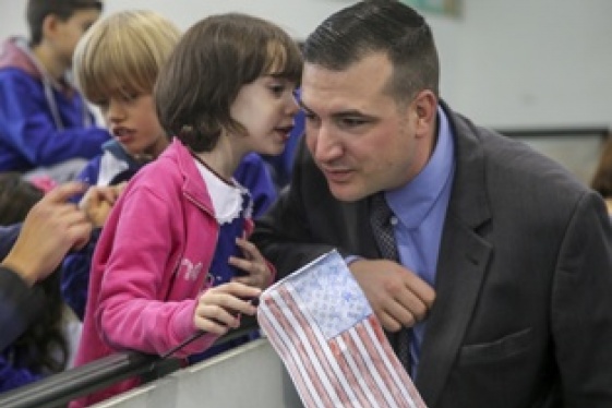 Thundering cheers, large welcoming posters and approximately 300 ferociously waving American and Italian flags greeted the Marines and sailors as they entered the San Giovanni Bosco Elementary School gymnasium In Giarre, Italy, November 16, 2016. Students, faculty and parent volunteers provided the enthusiastic welcome as the Marines and s...