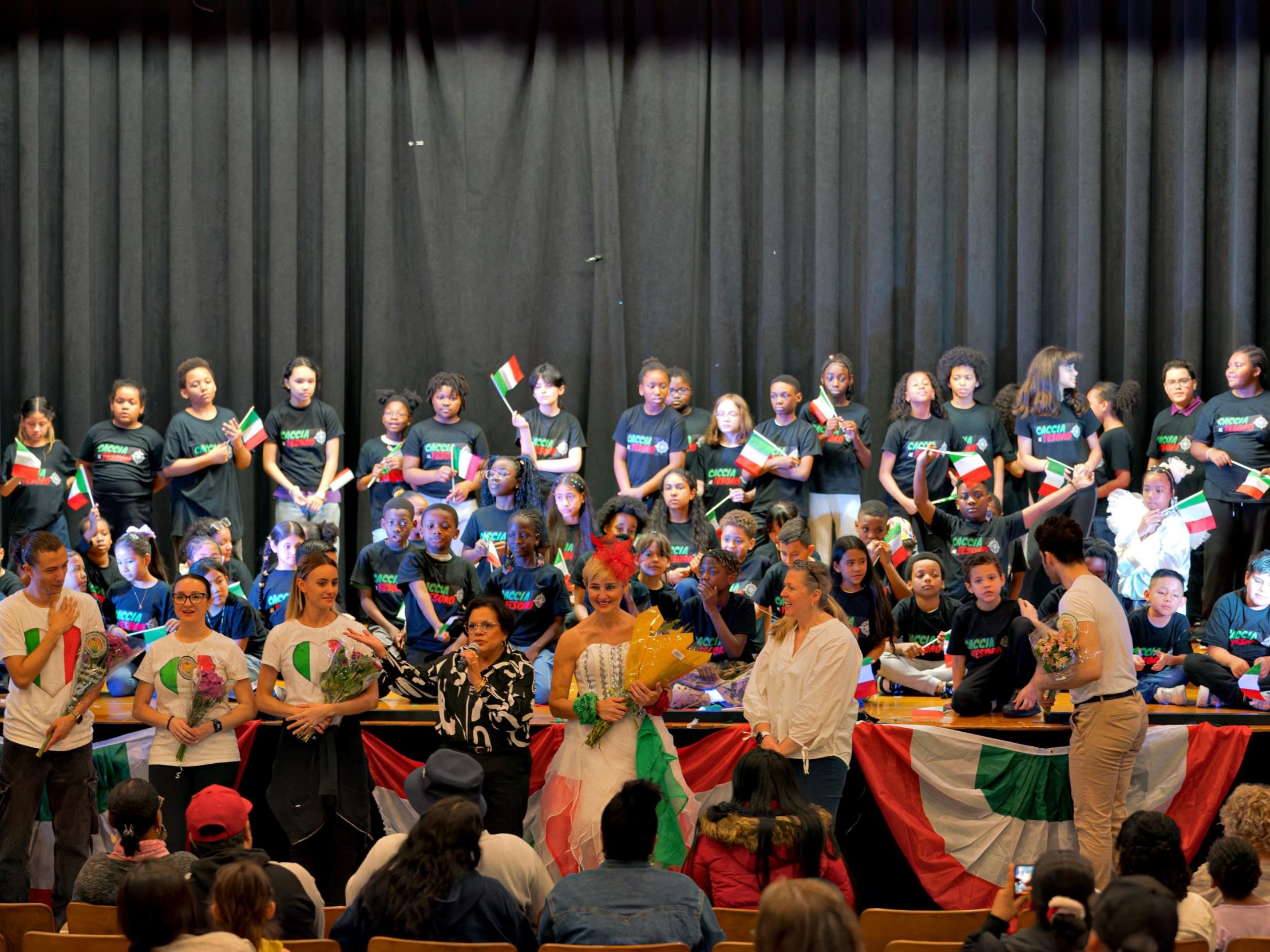 With the help of a professional team of teaching artists who are native Italian speakers and accomplished performers—the school auditorium transformed into a vibrant rehearsal space. Twice a week, students engaged in choreography, voice training, and character development, all while absorbing Italian vocabulary and expressions embedded in the musical’s songs. The culminating performance featured high-energy songs entirely in Italian, while narration and dialogue flowed between English and Italian, creating an accessible yet authentic bilingual experience. Costumes, props, and digital backdrops helped transport audiences to a fantastical journey.