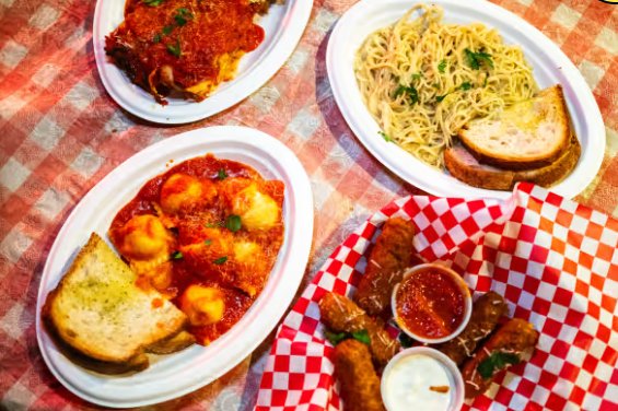 Marinara Miracles feels like the kind of place you stumble into by accident. It’s perched at the top of a creaky staircase above a dive bar, in what feels more like someone’s attic than an Italian restaurant. The reality is somewhere in between. The space is small, with a few red-and-white-checkered tables, plus an air hockey table and a TV that looks like it’s been there since the ‘70s. You’ll order your food at a little window, but the stacks of takeout containers in the kitchen hint that this spot may be more popular for delivery than dining in.