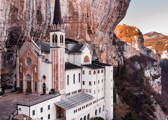 For centuries a place devoted to silence and meditation, the Sanctuary of Madonna della Corona is built into a vertical cliff face on Mount Baldo at 774 meters above sea level, overlooking the Adige valley, surrounded by a ‘crown’ of mountains, in the province of Verona.
