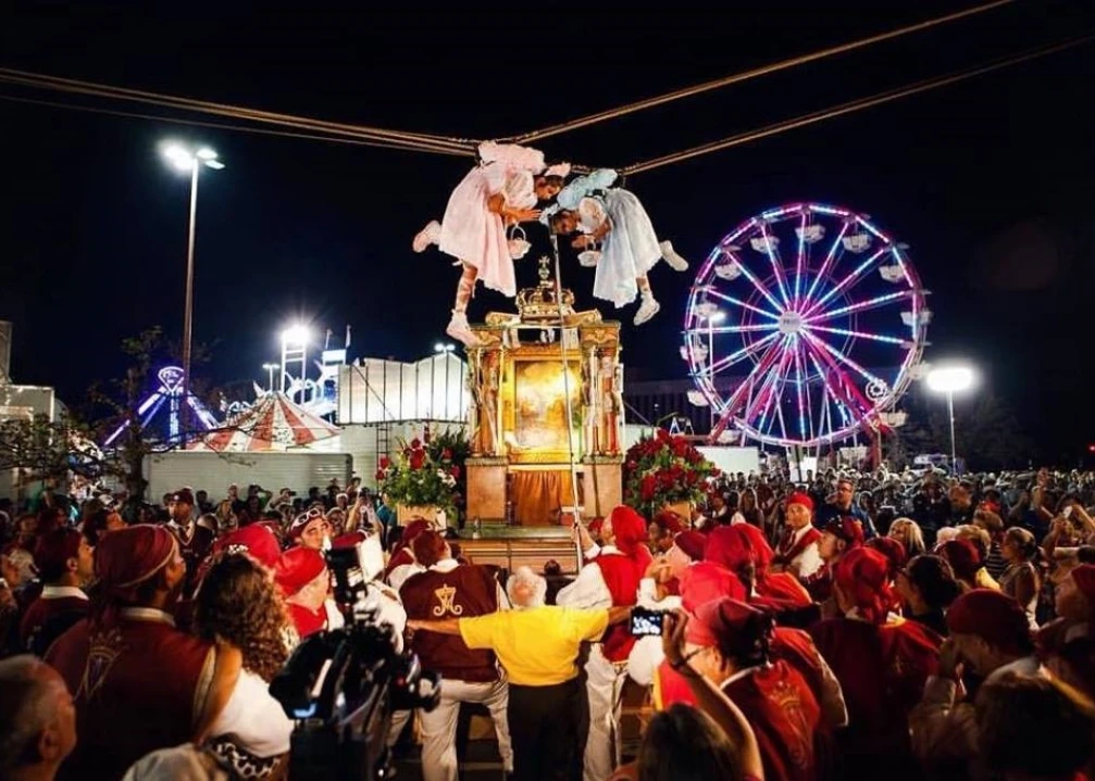The feast reaches its culmination on Sunday when it kicks off with a morning procession. The mass that follows has been celebrated by faithful priests and bishops; namely the late Cardinal Francis George who was a close friend of our society and a devotee of our Blessed Mother. The afternoon is kicked off with the main procesion which includes the Throne of the Blessed Mother and The Volata, or Flight of the Angels. The Flight of the Angels has been a time-honored tradition going back to Altavilla Milicia, Sicily. The evening wraps up with a beautiful fireworks display.