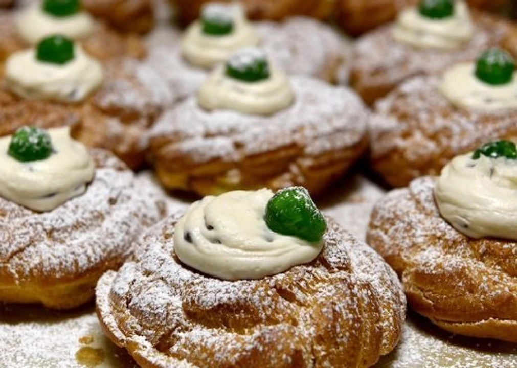 Giancarlo Palazzone grabbed a pastry bag Sunday and squeezed out little dabs of white cream onto a tray of deep-fried zeppole with cannoli-style filling. His fingers flew over the tray as he plunked a small black cherry atop each zeppole and then powdered them all with confectioners' sugar. These delicious pastries are variously baked or fried and filled with whipped cream, cannoli filling or custard.