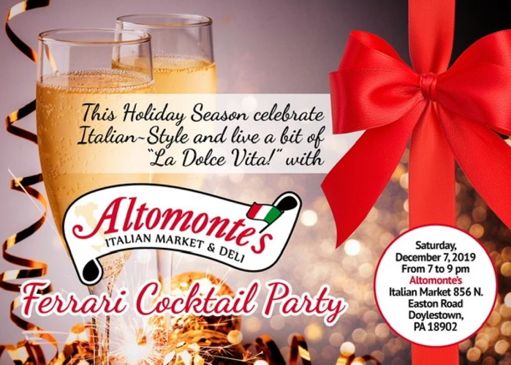 Kick off the holiday season and celebrate in style with family and friends at Altomontes’ Italian Market, 856 N. Easton Road, Doylestown PA on Saturday, December 7th from 7:00 to 9:00 pm. An all-inclusive epicurean evening where you can eat, drink and be merry!