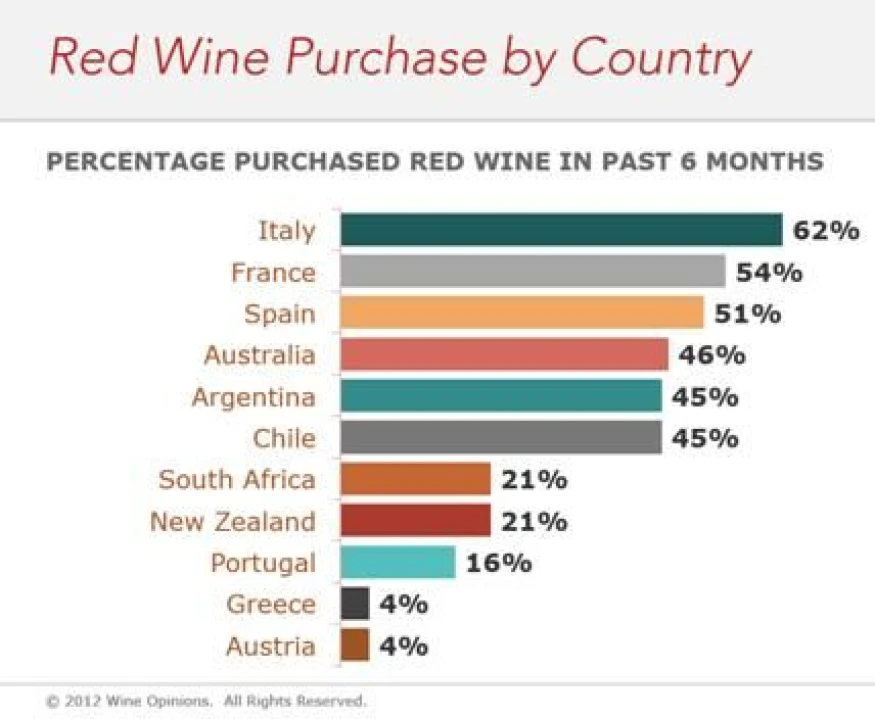 La ricerca evidenzia che i vini italiani più apprezzati sono quelli rossi: nel secondo semestre 2012 l'Italia risulta infatti al primo posto con il 62% delle vendite complessive, registrando un +8% sulla Francia e + 1% rispetto alla Spagna. Il Belpaese si posiziona invece al secondo posto nella classifica dei vini bianchi e dei rosé con il 35% di quantità di bottiglie vendute, dietro alla Francia (46%).