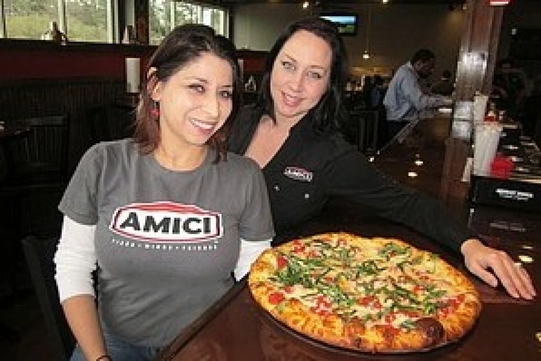 Above the doorway to the newest Amici Italian Cafe, prominently located at the corner of Flat Shoals and Parker roads, is emblazoned a slogan for the restaurant — "Pizza, Wings, Friends" — which sums up well the food and mood at this family-owned establishment.