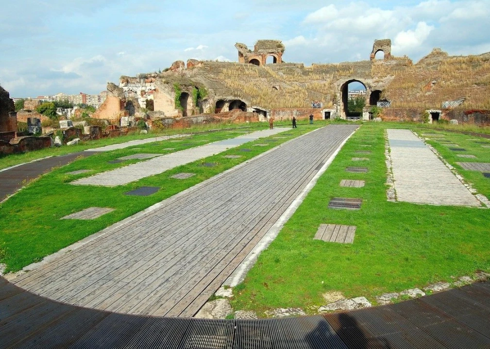 With a wide elliptical shape, measuring 170-meter-long major axis and a 139-meter-long minor axis, this is the second biggest amphitheatre ever built by Romans, behind only the Colosseum, which was itself modeled on Anfiteatro Campano. It was divided in four levels, with a total height of 46 meters and it was decorated with numerous statues.