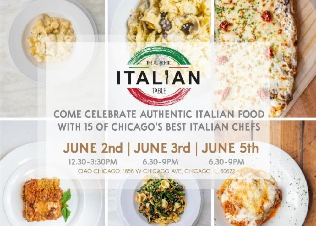 June 2,3 and 5, 2019. Ciao Chicago, 1656 West Chicago Ave, Chicago, IL. The Authentic Italian Table is a three-day expo organized by the Italian American Chamber of Commerce in Chicago as part of the True Italian Taste project (www.trueitaliantaste.com). Hosted at Ciao Chicago, each day will highlight 5 of Chicago's best Italian restaurants with live demos and dishes created from authentic Italian ingredients.