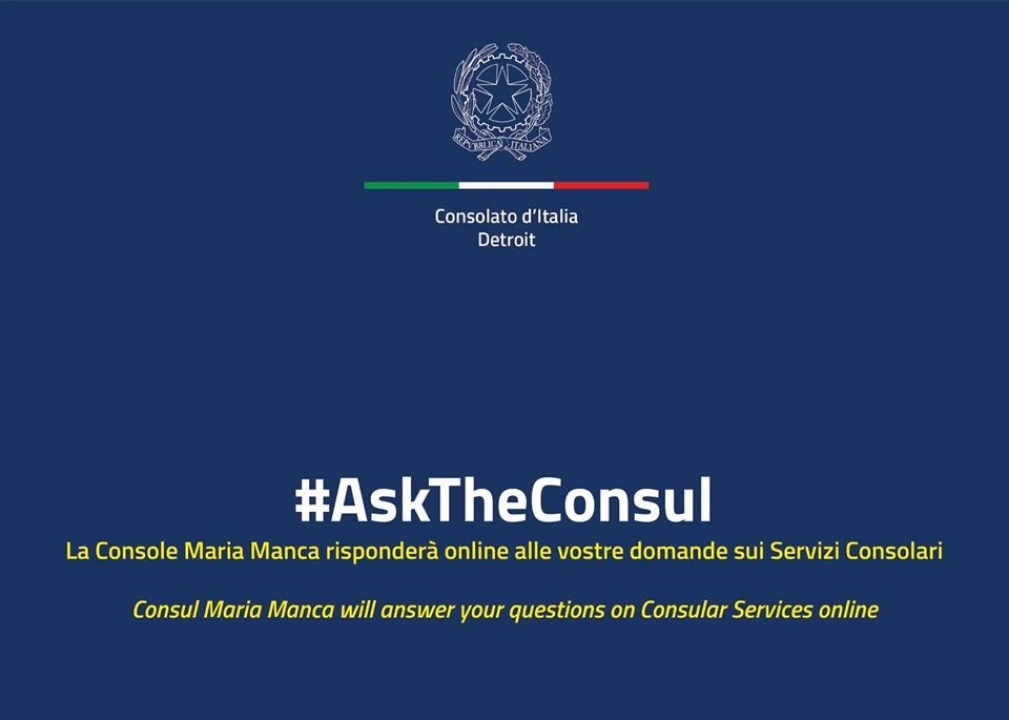 The Consulate of Italy in Detroit is hosting a new #AsktheConsul event. This time, you can ask questions about all of our Consular Services. Also, following this public online event, if you have questions regarding your own specific case, Consul Manca will answer them in private on Facebook Messenger.
