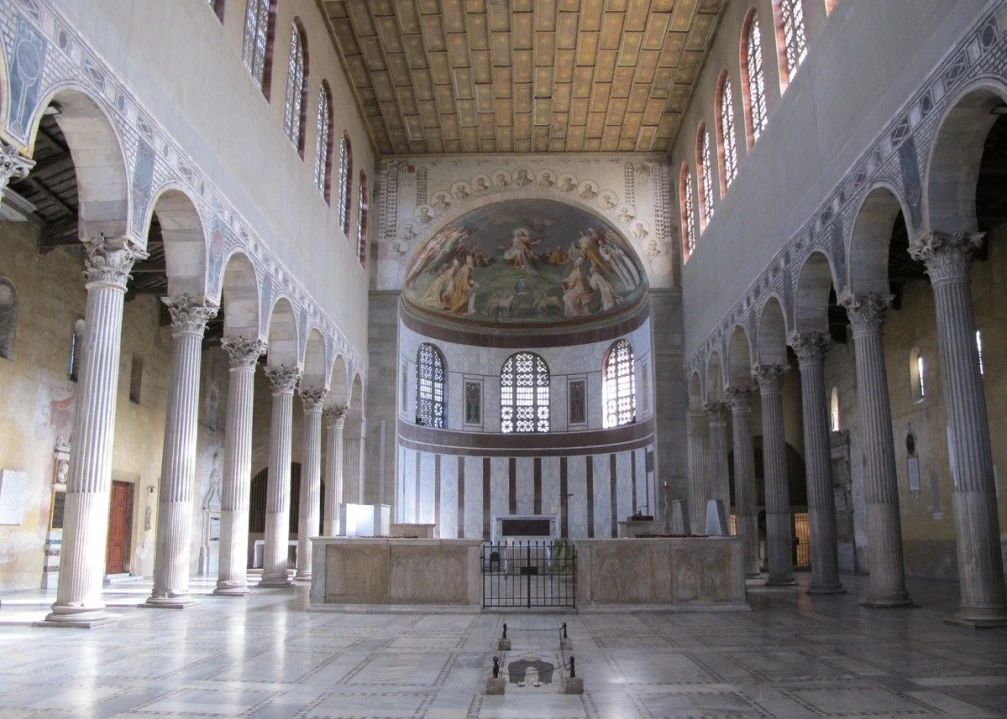 The Basilica of Santa Sabina was built by one Peter of Illyria during the reigns of Popes Celestine I (422-432) and Sixtus III (432-440), as testified by the magnificent golden mosaic inscription opposite the apse. This is the only surviving mosaic, as many others would have decorated the space between the arcades and the clerestory.