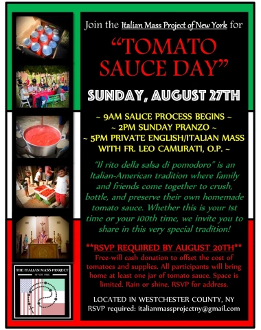 In terms of activities, we focus on hosting events where Italian Americans have the opportunity to form greater bonds. I am especially looking forward to our upcoming IMPNY “Tomato Sauce Day.” This is our adaption of “il rito della salsa di pomodoro” or the tradition where paesani come together to crush and preserve hundreds of bottles of homemade tomato sauce each summer. As a group, we will begin making tomato sauce from scratch early in the morning, followed by Sunday pranzo, and concluding with a private bilingual English/Italian Mass. Last summer, many of our participants either had grown up making tomato sauce, but no longer had any friends or family to assist in the process, or had heard about the tradition, but never had the opportunity to partake in it. Regardless, all participants found it to be a productive community-building activity that was both tangible and spiritual. This year, there will be at least forty of us, so if you take a trip to New York at the end of August, you are more than welcome to join!