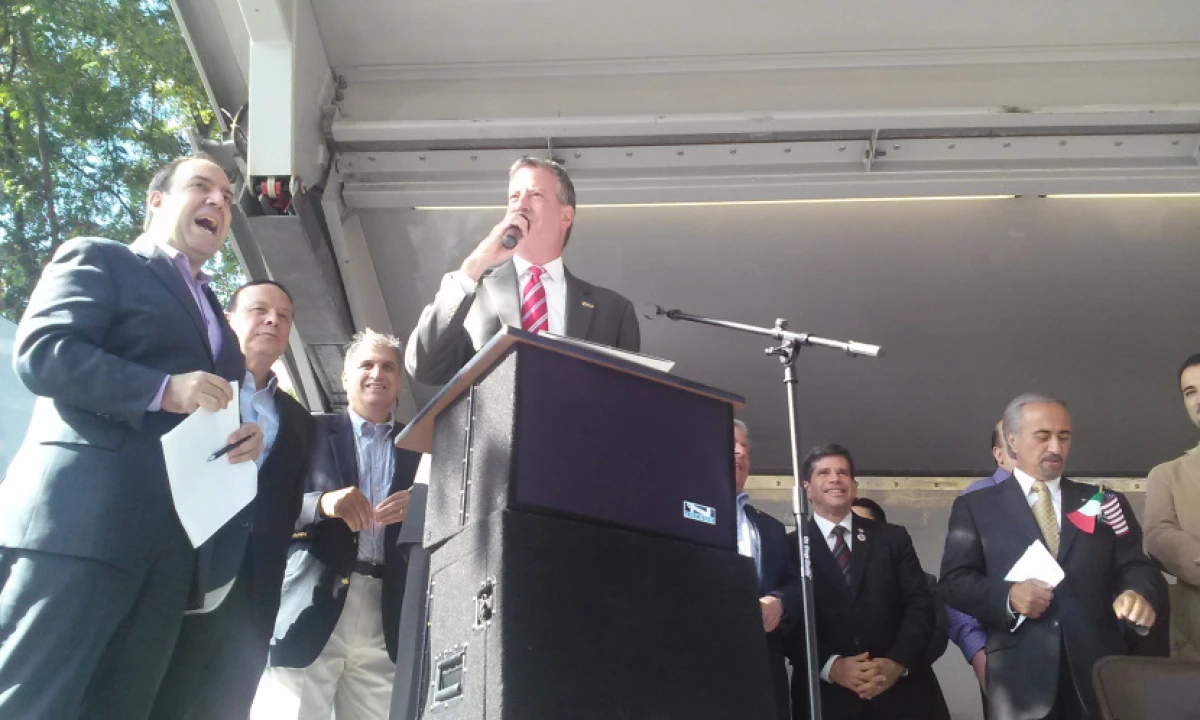 "Buongiorno!" Bill de Blasio exclaimed as he began a speech today. "Viva Italia!". The front-running mayoral candidate's Italian heritage was on full display this afternoon when he made an appearance at the end of the annual Columbus Day Parade in Bensonhurst, a neighborhood that was once the heart of Brooklyn's Italian-American community. Giving his address to a small crowd, Mr. de Blasio relentlessly extolled Italy and all of those who descend from the country's diaspora.
