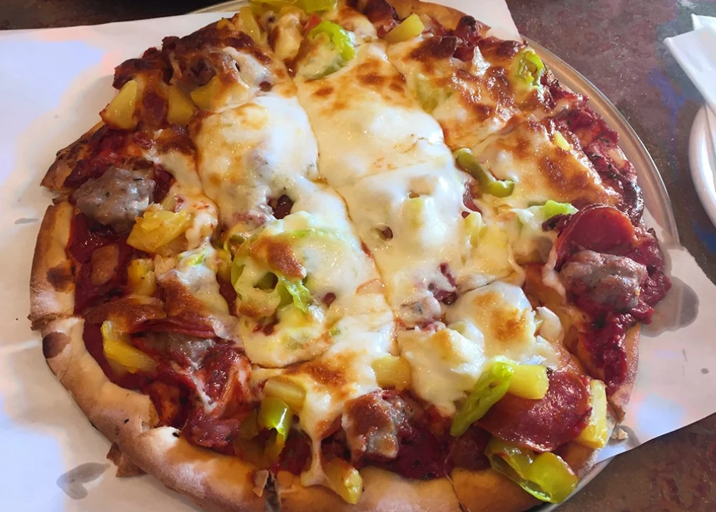 There’s something disarming and charming about a dish that brags up its own effectiveness. The Flavor Explosion pizza at Mama’s Pizza talks a good game, and it delivers: sausage, pepperoni, bacon, banana peppers, and pineapple.