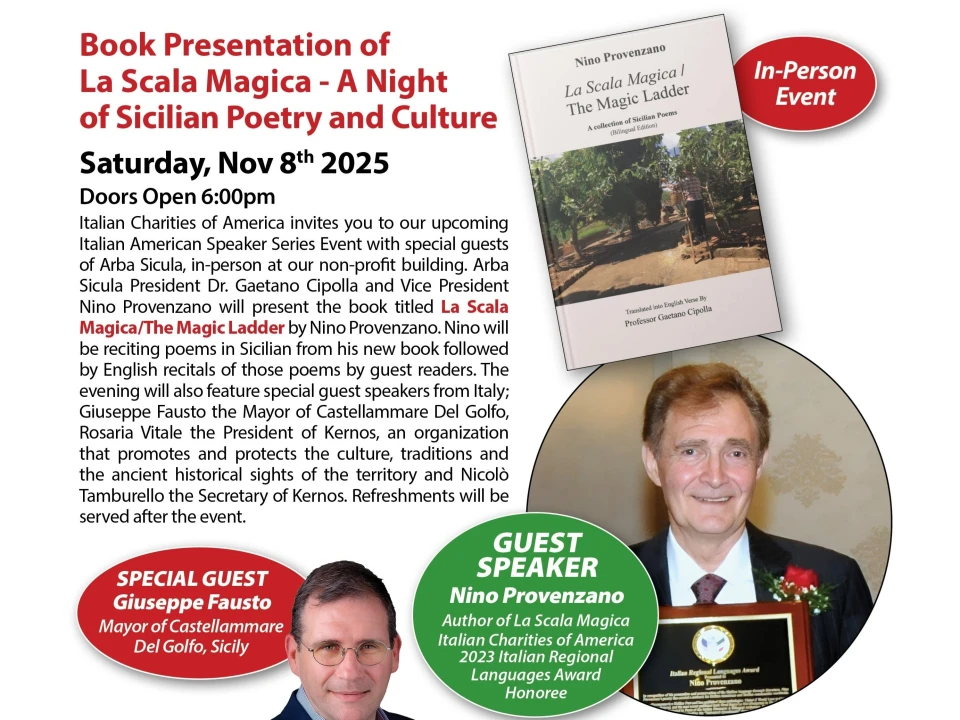 Join Italian Charities of America For Our Italian American Speaker Series: Book Presentation of La Scala Magica/The Magic Ladder - A Night of Sicilian Poetry and Culture. In-Person Event on Saturday, November 8th. Doors Open at 6:00pm EST, 83-20 Queens Blvd. Elmhurst NY 11373. Please register here to reserve your seat!