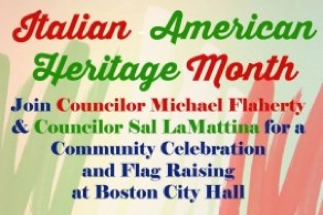 Boston City Councilors Michael Flaherty and Sal LaMattina will host this year's Italian flag raising at Boston City Hall in honor of Italian-American Heritage Month. Join friends and families in a community celebration that will feature honored guests, entertainment and refreshments. "It is a privilege to join my friends in the Italian-American community to celebrate their accomplishments and contributions in Boston during this historic month," said Councilor Flaherty.