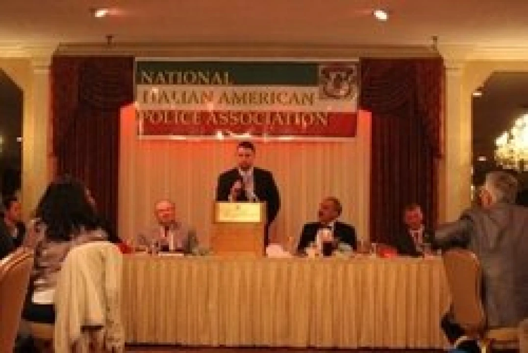 A Boston police officer recovering after being shot in the face during a traffic stop was honored by the National Association of Italian American Police Officers on Saturday. Officer John Moynihan, 34, was shot just below his right eye in March, with the bullet lodging below his right ear.