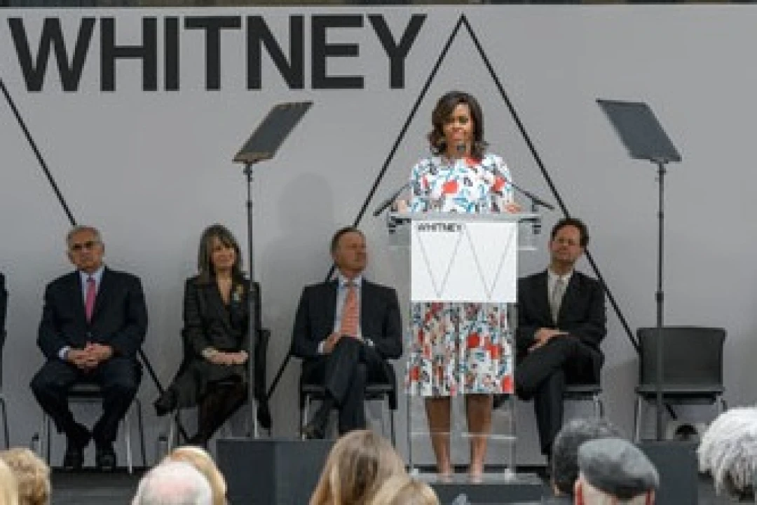 To cap off a two-week press blitz leading up to the opening of the Whitney Museum of American Art's new building in the Meatpacking District on May 1, First Lady Michelle Obama, Mayor Bill de Blasio, Whitney director Adam Weinberg, and architect Renzo Piano attended a dedication ceremony Thursday morning on the street outside the institution.