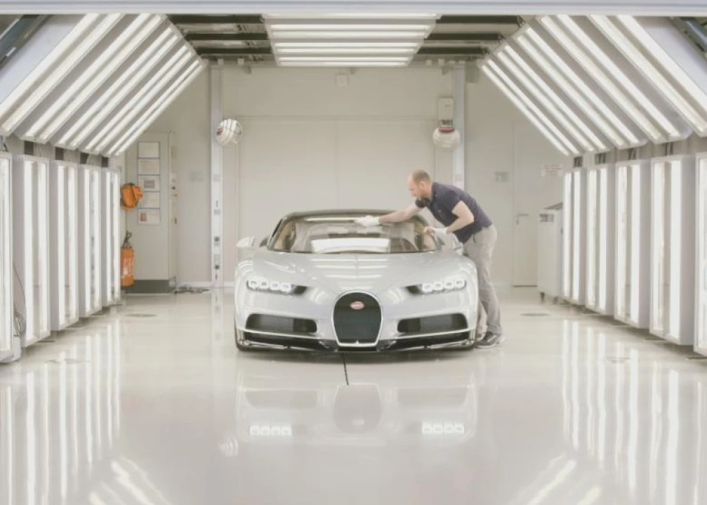 Inside the small glass building where some of the fastest cars in the world are made, there is never a sense of haste. There is also little noise. In a tunnel lined with blazing white lights, workers can look for tiny imperfections in the finished product. Elsewhere, they slide a 16-cylinder engine into its home just behind the driver's seat. Occasionally, they gather at a central table for a meeting.