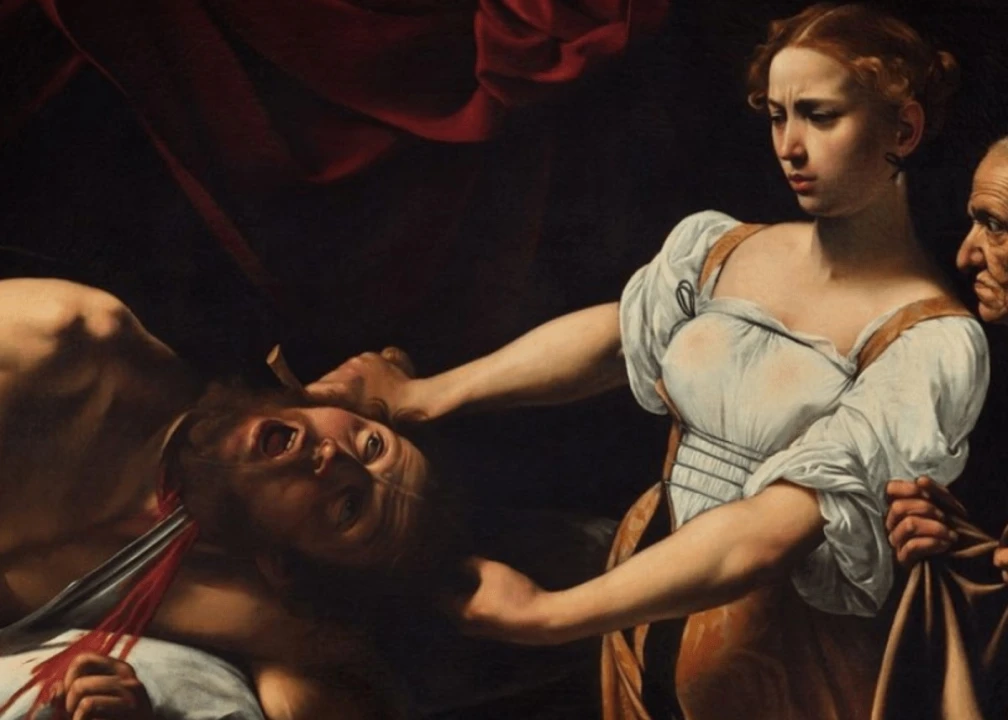 The work, which was completed in 1599, is on loan from the Gallerie Nazionali di Arte Antica in Rome. It depicts a scene from the Old Testament of the Bible in which a widow, Judith, beheads a general, Holofernes.