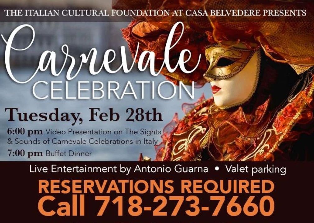 MEMBERS: $75 per person. NON-MEMBERS: $85 per person. Dinner includes beer, wine and soda. Cash Bar & Valet Parking will be available. RESERVATIONS MUST BE MADE IN ADVANCE WITH PAYMENT. Please call 718-273-7660 or email [email protected] To reserve and pay online, go to www.casa-belvedere.org Click any DONATE NOW button and complete the online giving form. Please indicate 'Carnevale' in the comments box. The Italian Cultural Foundation at Casa Belvedere, 79 Howard Avenue, Staten Island, NY 10301