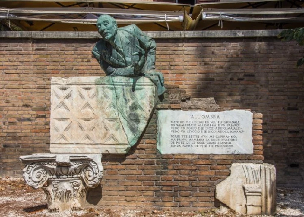Like his forebear, Trilussa has a restaurant named after him (Taverna Trilussa in Via del Politeama), not to mention a hotel further up the avenue. There’s a Trilussa hardware store – not unsuitable given the down-to-earth nature of his verse. Then there is also an eponymous square flanking the Tiber: up from an amalgam of ancient stone emerges his bronze head turned bluish green with time, then a hand, fingers scanning the air for his audience.