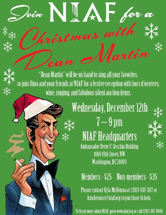 Join NIAF and their friends for a spirited holiday reception on Wednesday, Dec. 12, at NIAF headquarters! "Dean Martin" (actor, vocalist and master Dino tribute performer Eric Richardson) will be on hand to bring back memories of the humor and songs that made the Rat Pack's "King of Cool" so cool. This fun and festive reception includes hors d'oeuvres, wine, singing, a silent auction and a drawing! Everyone's welcome! Dec. 12, 7-9 p.m., at NIAF Headquarters, The Ambassador Peter F. Secchia Building, 1860 19th St. NW, Washington, D.C. NIAF members: $25; non-members: $35. For more information and tickets, contact Kyla McKenna at 202-939-3117 or [email protected].