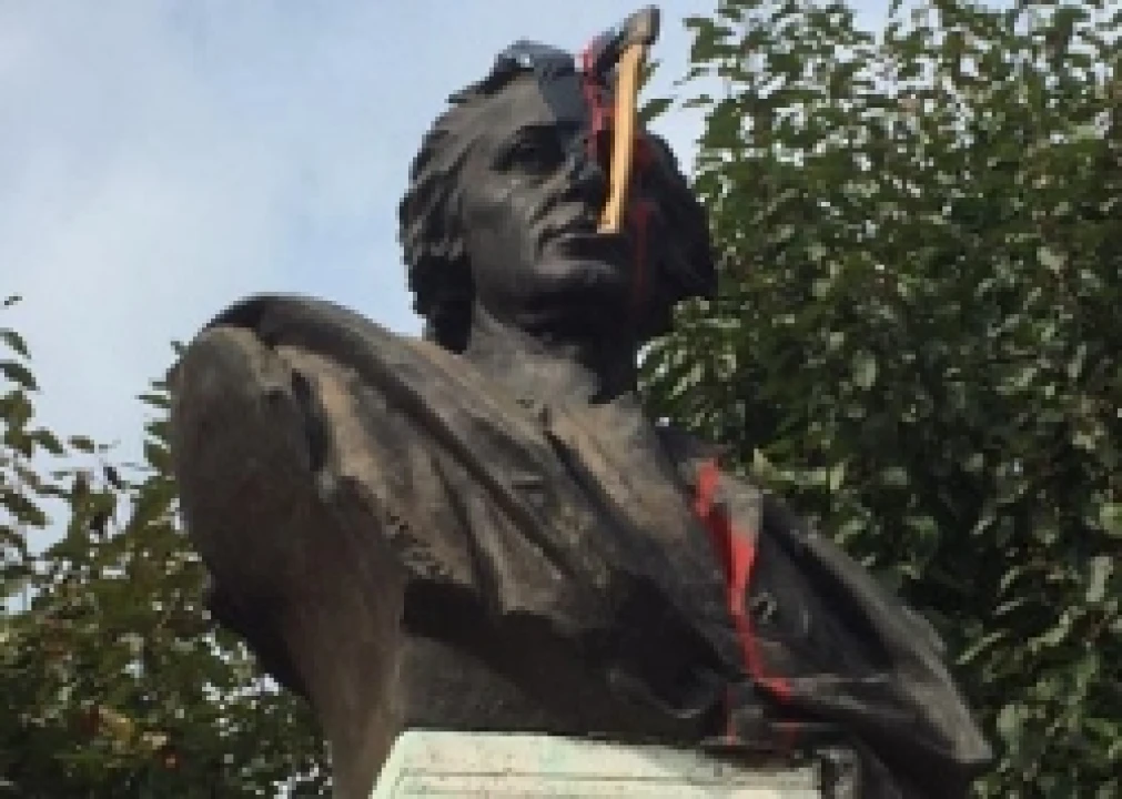 In what could be dubbed an act of criminal irony, a statue of Christopher Columbus in downtown Detroit was vandalized just in time for this year's Columbus Day. The statue, located at Jefferson and Randolph right next to city hall, was splashed with fake blood, and a hatchet was taped to his forehead as if it had just been struck.
