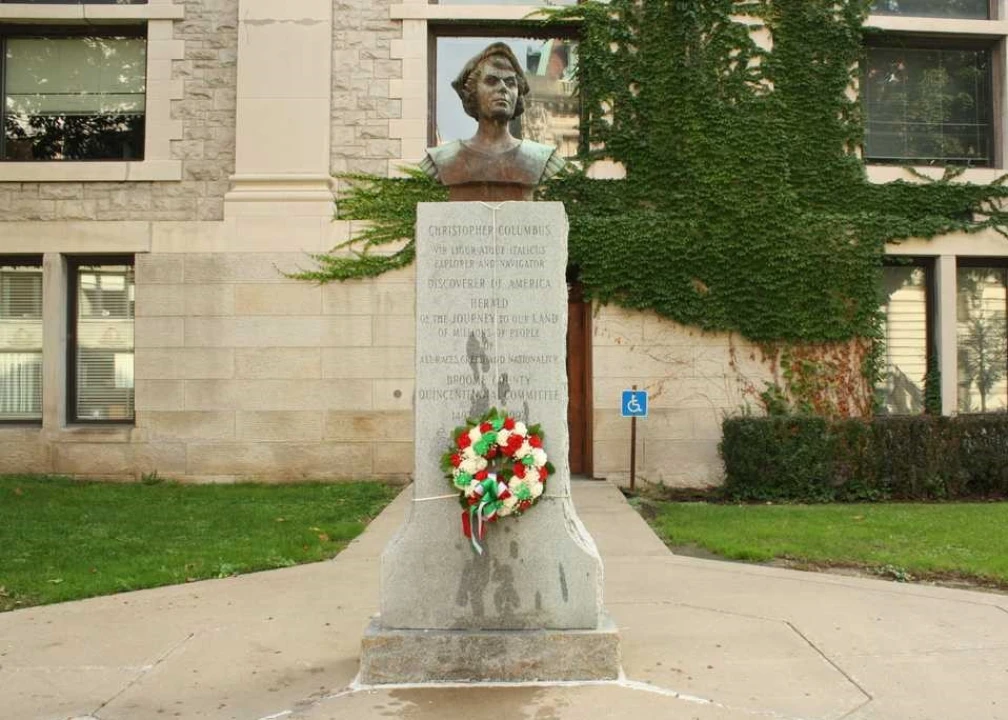 A red, white and green wreath hung off the statue of Christopher Columbus in downtown Binghamton on Monday morning. Every year, members of the Sons of Italy Lodge #487 and Duca Degli Abruzzi Lodge #443 place the wreath on the statue to commemorate not only Columbus, but Italian contributions to the local community.