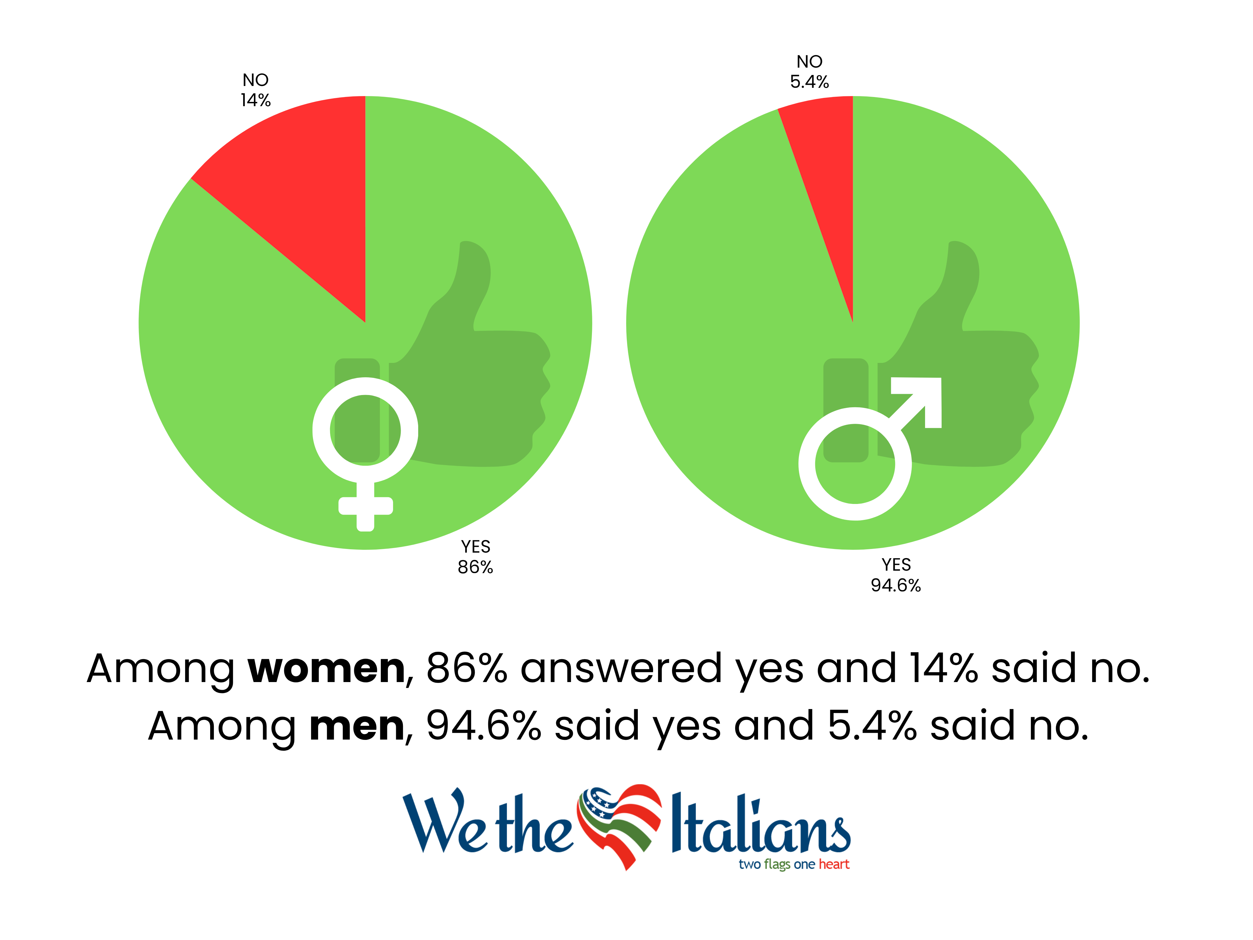 Among women, 86% answered yes and 14% said no. Among men, 94.6% said yes and 5.4% said no.