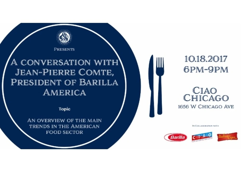 The Italian American Chamber of Commerce invites you to A conversation with Jean-Pierre Comte, president of Barilla America. Wednesday October 18th, 2017. 6:00pm panel discussion. Followed by a tasting of Italian recipes. Ciao Chicago - 1656 W. Chicago Ave, Chicago, IL 60622