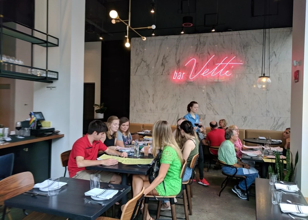 First of all, the clean, upscale feel of the place — the neon “bar Vetti” sign on the wall commands attention as soon as you walk in — doesn’t mean it isn’t a cozy spot to have a meal with friends and enjoy a cocktail or two. The restaurant is oddly situated in the ground floor of the 800 Building, just south of downtown, yet it somehow belongs.
