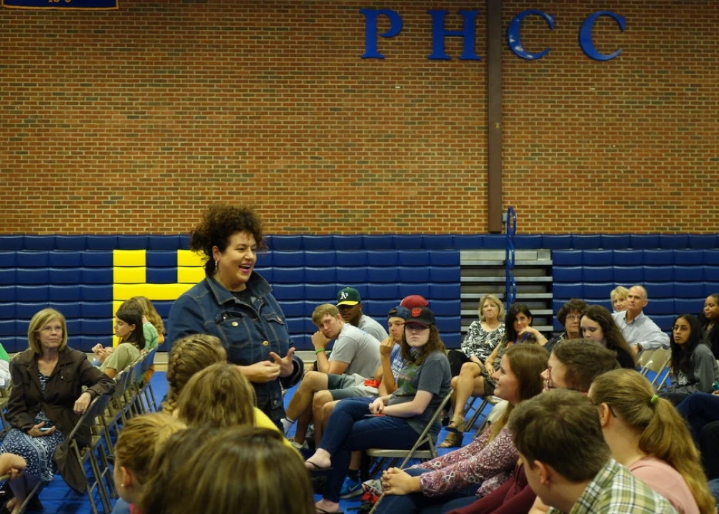 Despite its spot in front of a huge crowd buzzing with excitement for author Adriana Trigiani’s talk Thursday at Patrick Henry Community College, the podium remained empty. Instead, after an impressive introduction by Dean of Academic Success and Student Transfer Terry Young, a woman’s voice boomed out from behind the audience. She quipped that it sounded like he just gave a great obituary.