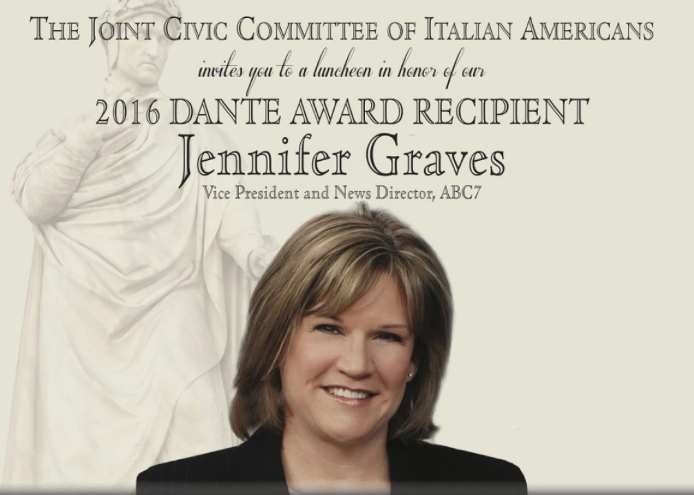 Each year, the Human Relations Committee presents the coveted Dante Award to a member of the local news media who has answered Dante Alighieri’s call to be “no timid friend to truth.” Past recipients have been Irv Kupcinet, John Madigan, Hugh Hill, Dick Kay, Joan Esposito, Walter Jacobson, Mark Giangreco, Emily Barr, Larry Wert, Allison Rosati, Joe Ahern, Merri Dee, Dominic Mancuso, Frank Mathie, Vince Gerasole, Ron Magers, Janet Davies, Greg Caputo, Neil Stienberg, Linda Yu, Stella Foster, Tom McNamee and Bruce Dold. In addition the Filippo Mazzei Public Affairs award is also awarded.