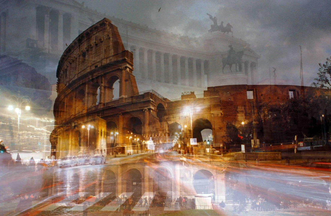 Bramante says, "The photos featured in the exhibit combine anywhere from 4 to 9 images, shooting several analog shots on the same frame using common film such as 35 millimeter." Bramante's vision, motive, and approach coalesce into groundbreaking creativity with this new photographic project. Each photo consists of a mesmerizing montage, blending images of the ancient and the contemporary city. The result is a poetic and passionate vision of the Italian capital -- an archeological scrapbook of the Eternal City across the millennia, a composite architectural portrait.