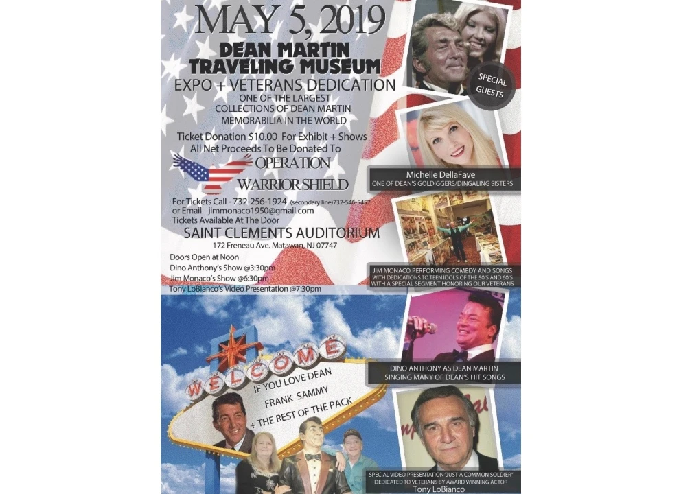 On Sunday, May 5 there is a wonderful Dean Martin Traveling Museum Expo and Veteran's Dedication event at the Saint Clements Auditorium, 172 Freneau Ave, in Matawan, NJ hosted by Jim Monaco to benefit Operation Warrior Shield. Jim is the number one collector of Dean Martin memorabilia in the world, and he will have his collection on display there.