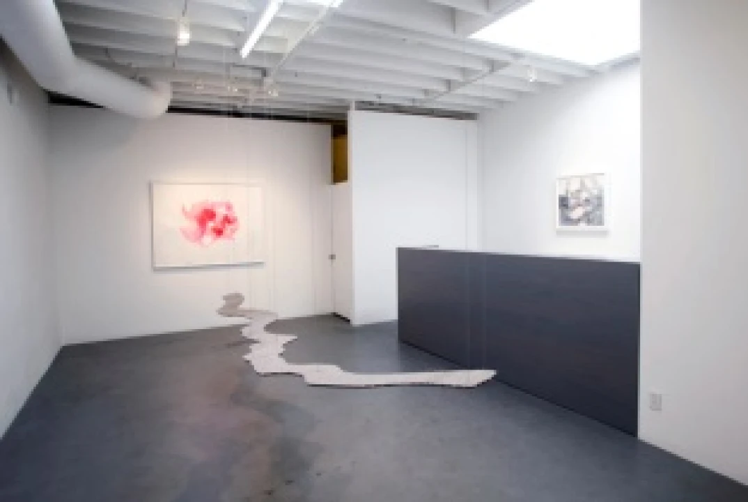 Her paintings and drawings, intriguing landscapes formed by repetitive text and splashes of color, along with a large suspended metal sculpture, are on display at Marine Contemporary in Venice, California.