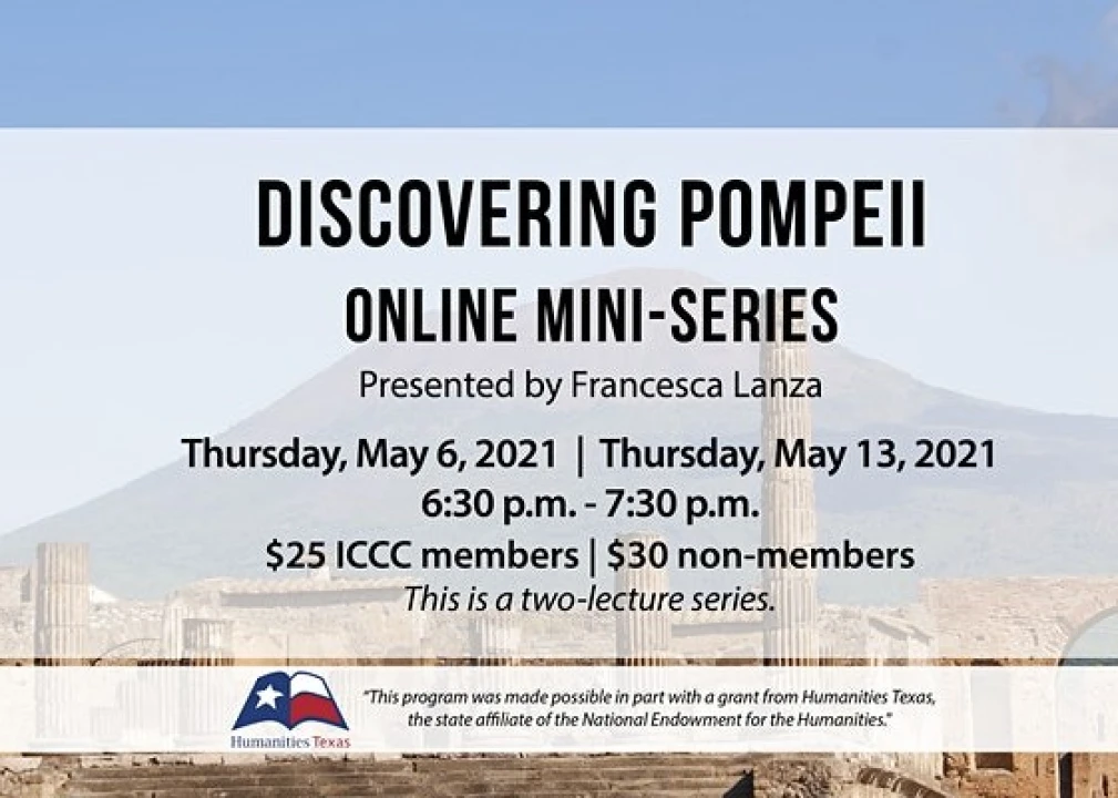 Fri, May 7, 2021. 1:30 AM – 2:30 AM CEST. Online event. The Italian Cultural & Community Center is excited to present a two-lecture series on Pompeii and its incredible history. Join us to learn about this wonderful ancient city: a unique archeological site where it is possible to travel back in time owing to the unfortunate eruption of Vesuvius in 79 A.D. that preserved most of the city under several feet of rock and ashes, until it was discovered in 1748.