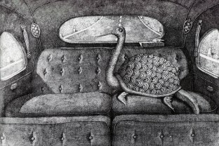 But this year there was something more at the Biennial. It's about a series of works painted with a mixed technique made by ink, tempera and acrylics but resulting monochromatic, as a print, entitled "What is a monster ?". Together with the technique, the pleasure of the works of Gnoli changes too: this series looks like a work of Escher or Magritte, but engraved by Durer. There are fantastic beasts created by taking parts of various animals that actually exist, and that are placed in everyday situations such as bathing in a bathtub, being seated on a sofa or getting a cab. Even here we find objects typical of the main Gnoli works, but this time they are seen from a distance, becoming part of the setting of the experience of these bourgeois and citizen "monsters".