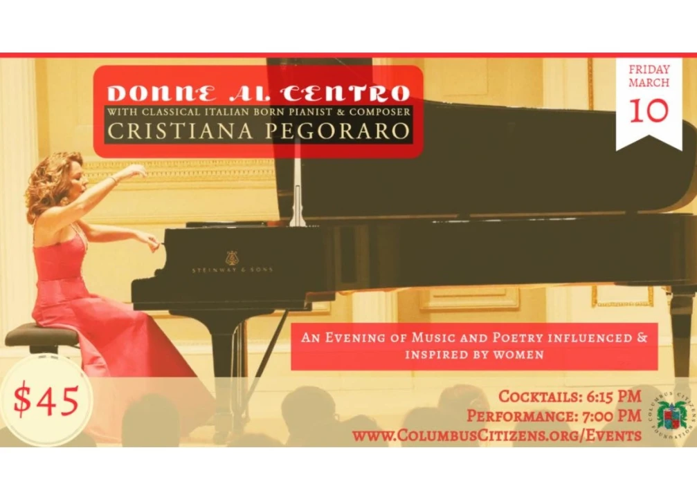 If you missed Cristiana Pegoraro in the fall, make sure you put Friday, March 10 on your calendar. The evening of music and poetry influenced & inspired by women begins with a reception at 6:15 PM. Columbus Citizens Foundation - 8 East 69th Street, New York, NY 10021 RSVP Here. Cristiana's return to the Townhouse is dedicated to women and passion, and inspired by International Women’s Day, which is celebrated on March 8.