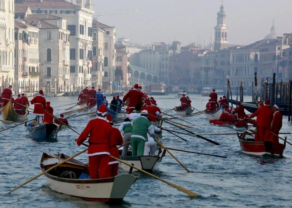 Dozens of rowers dressed as Father Christmas raced down Venice's Grand Canal on Sunday, cheered on by crowds gathered to watch the annual fancy-dress regata. Organised by the University Ca' Foscari, the eighth edition of the race set off from Saint Mark's Square, with champions and amateurs competing in traditional "mascarete" boats -- once the domain of fishermen.