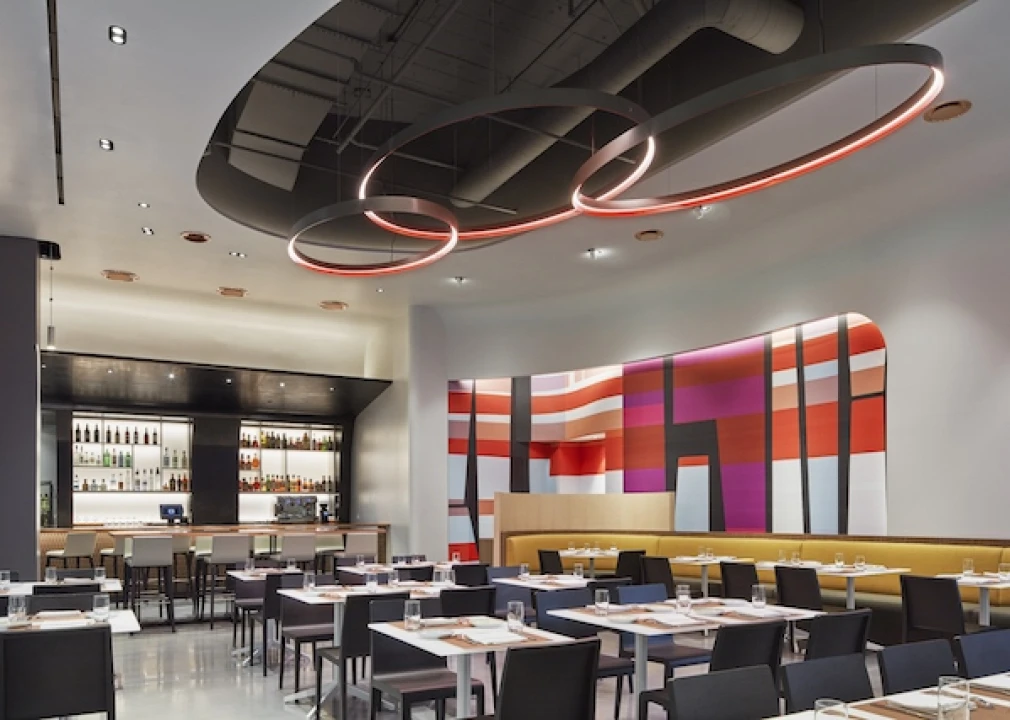The Petersen Automotive Museum now has a restaurant where you can dine on modern Italian cuisine if you're feeling peckish after salivating over a $2.6 million Bugatti. Drago Ristorante now joins the ranks of Los Angeles' esteemed museum-adjacent restaurants, like The Broad's Otium or LACMA's Ray's & Stark Bar. The Italian eatery opened in December, and has a sleek, mod design courtesy of Felderman Keatinge + Associates. Bright walls in reds and purples prevent otherwise white space from feeling too sterile.