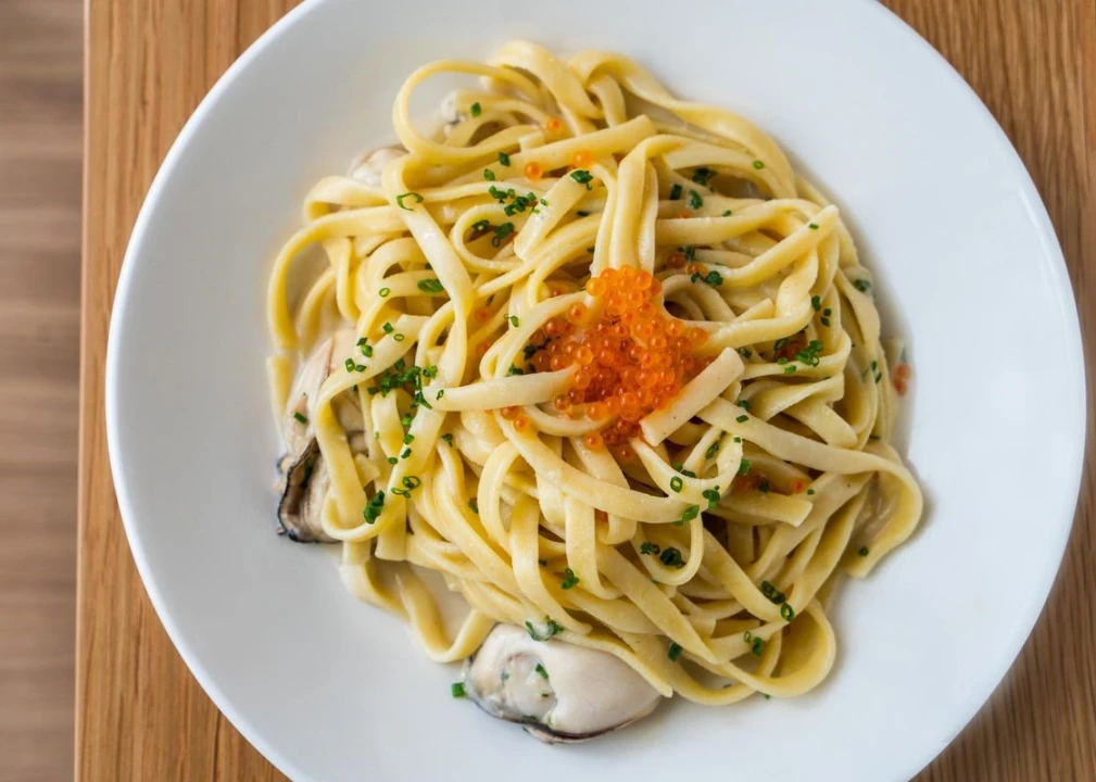 The minimalist design features light oak and gray furniture, with a 60-foot bar and glass pendant chandelier as the centerpieces. The restaurant’s 134 seats are spread across a dining room, bar, and a lounge area. There’s also a private events space that can seat up to 40 people.