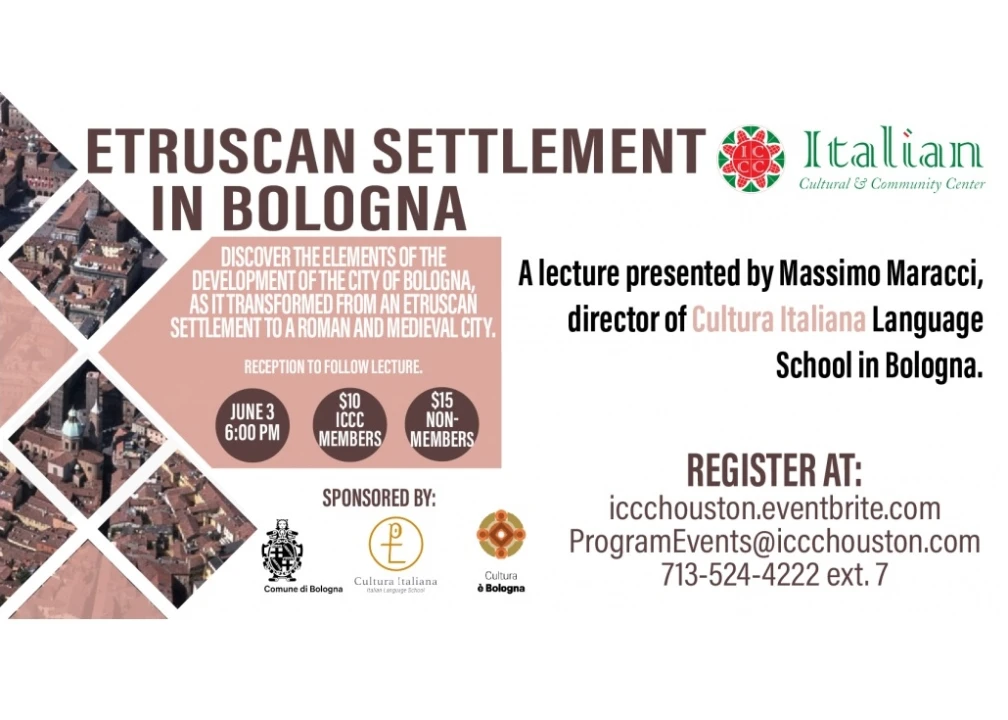 Join us at the ICCC to discover the role the Etruscans played in the development of the city of Bologna. Saturday, June 3, 2017. Lecture starts at 6:00 pm, doors open at 5:30pm. Previous registration not required, but suggested: Suggested donation at the door - $10 for members, $15 for non-members
