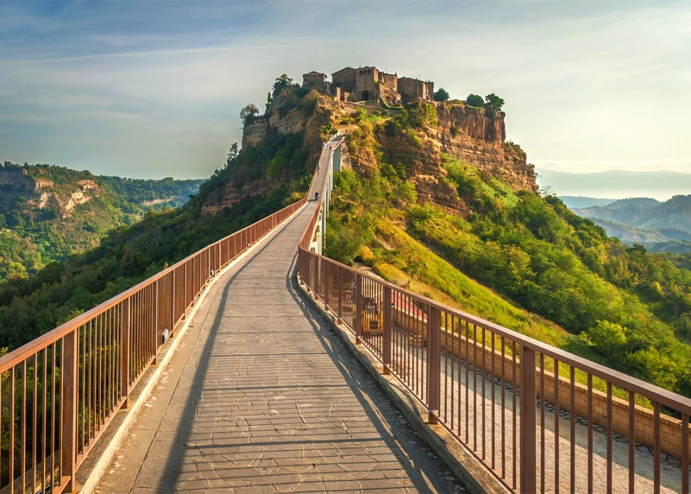 The pristine medieval village Civita di Bagnoregio has paradoxically found a boom in tourism due to its slow, steady collapse down a jagged cliff of volcanic rock. Its nickname is Il Paese che Muore because it has actually been collapsing for centuries down wooded hills and canyons.