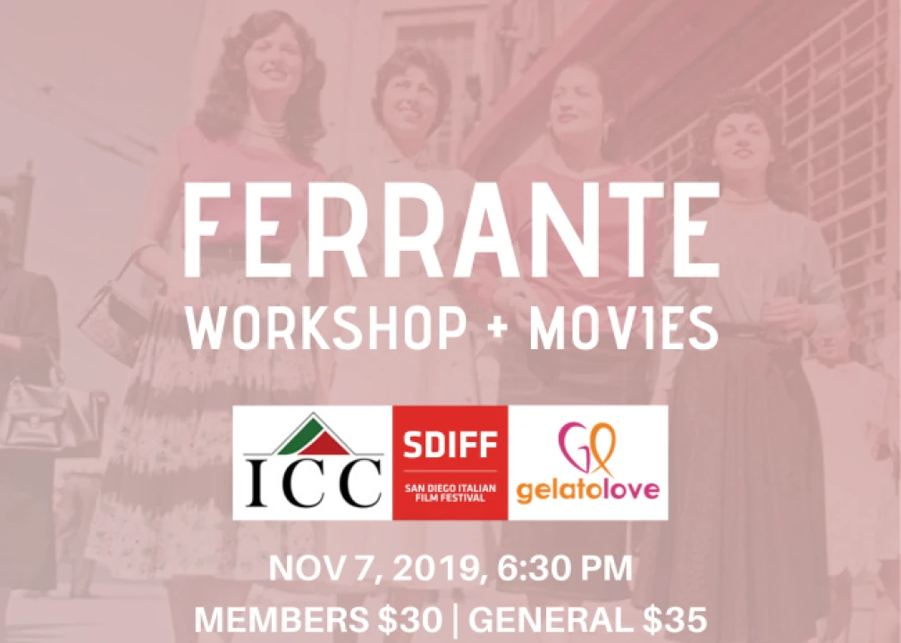 Join members of ICC and SDIFF for a night revolving around the world of Elena Ferrante. SDIFF Executive Director Diana Agostini and SDIFF Artistic Director Antonio Iannotta will hold a workshop on Elena Ferrante's first two novels: L'amore molesto and I giorni dell'abbandono. The workshop will be taught in English, with references to the original texts.