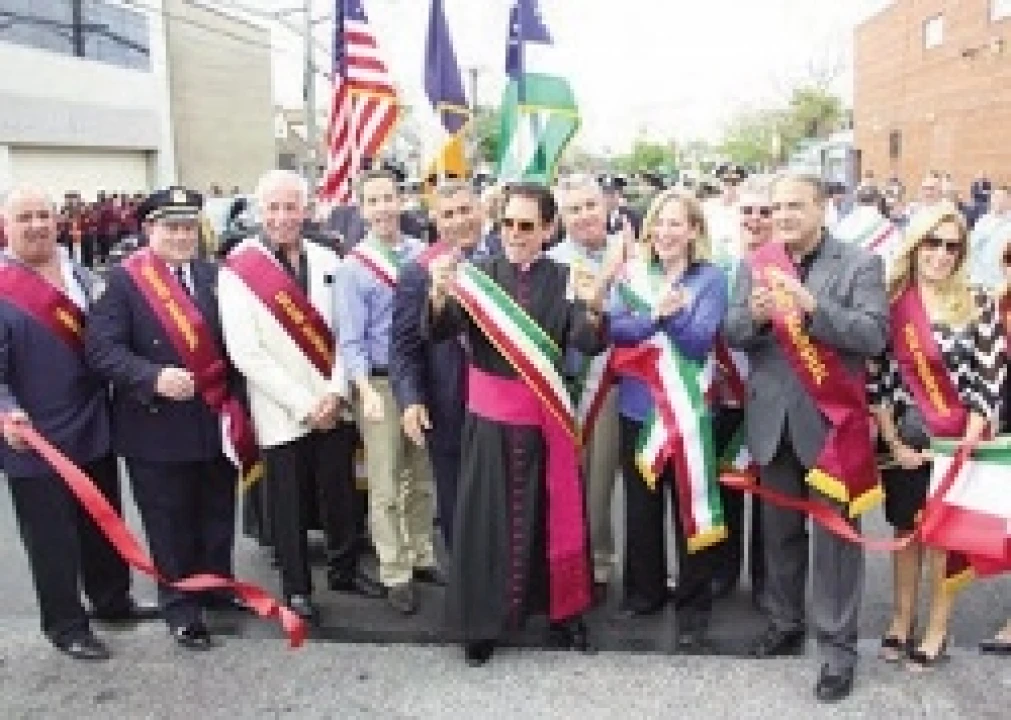 Queens Borough President Melinda Katz (fourth from l.) applauds as Monsignor Jamie Gigantiello, the Grand Marshal of the Howard Beach Columbus Day Parade, cut the ribbon to start the 10th anniversary edition of the parade on Cross Bay Boulevard on Sunday, September 27.